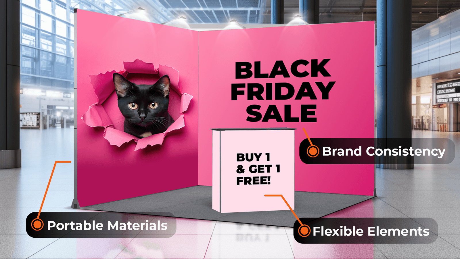 Not every exhibition space will be the same, so it helps to have design elements that can easily adapt. Modular displays are a great choice because they can be reconfigured to fit different booth layouts.